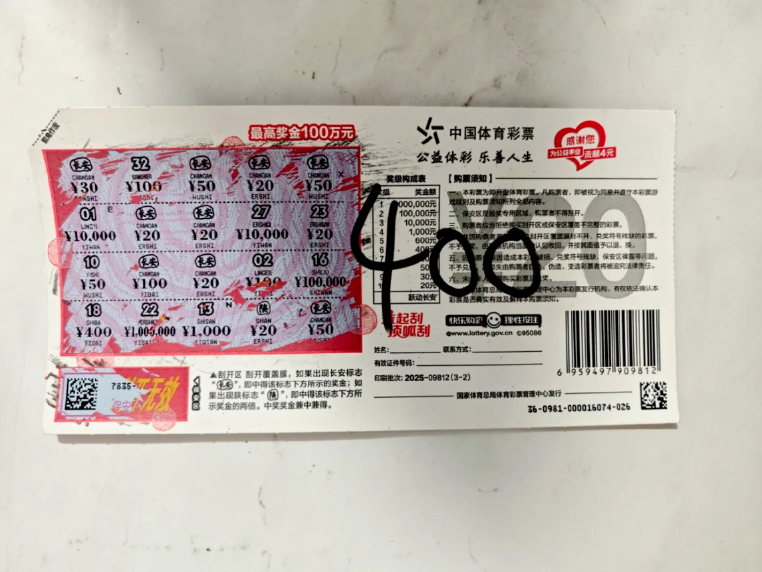 宝鸡市杨先生(化姓)是体彩顶呱刮的忠实粉丝,周一下班路过体彩实体店,看到店门口贴的活动宣传海报就进店准备看一下到底是啥活动,销售员向杨先生详细介绍了本次的活动内容,建议他可以刮几张尝试一下。杨先生听完很有兴趣,便随便刮了几张,没想到最后一张竟然中了400元奖金!通过扫码并赠送了一张3元的大乐透彩票,杨先生表示,真的是太幸运了,以后还会继续关注公益体彩,继续关注顶呱刮,奉献一份爱心给社会。