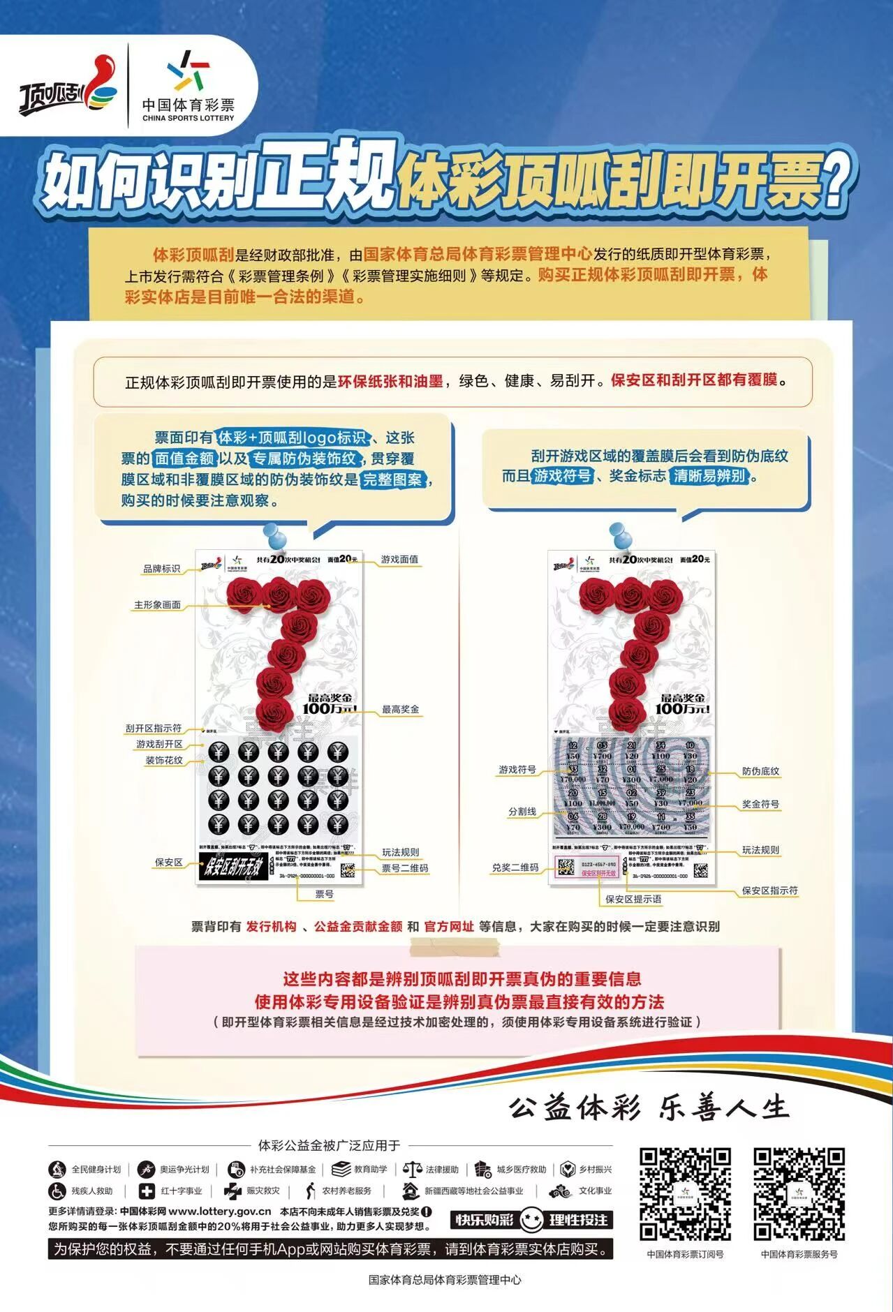 那么,作为购彩者,应如何快速辨别手中的即开票是否为官方发行的顶呱刮即开票呢?中国体育彩票特此提供了辨别指南: