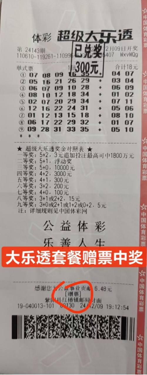 在活动期间,不光套餐票可以中奖,套餐票的赠票也会给您带来不一样的惊喜。来自紫阳的庞先生(化姓)说:“大乐透开奖日,到店里去正在纠结选什么,代销者就给我推荐新上线的套餐票试了一下,没想到买18元套餐票还送了18元的赠票,这本来就是一个小惊喜,没想到赠票还中了300元,这活动太给力了。”