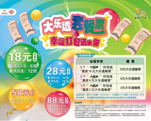 为了回馈广大购彩者对体彩的支持,陕西体彩于2024年11月7日为全省网点开通了大乐透套餐票功能。随着新功能的上市,陕西体彩同步开展了“大乐透套餐票 幸运打包送给你”活动,活动时间为11月20日21:10-12月30日21:00,活动期间凡在陕西省内体育彩票实体店购买大乐透套餐票,即可参与本次活动。本次大乐透套餐票主要有以下四个套餐: