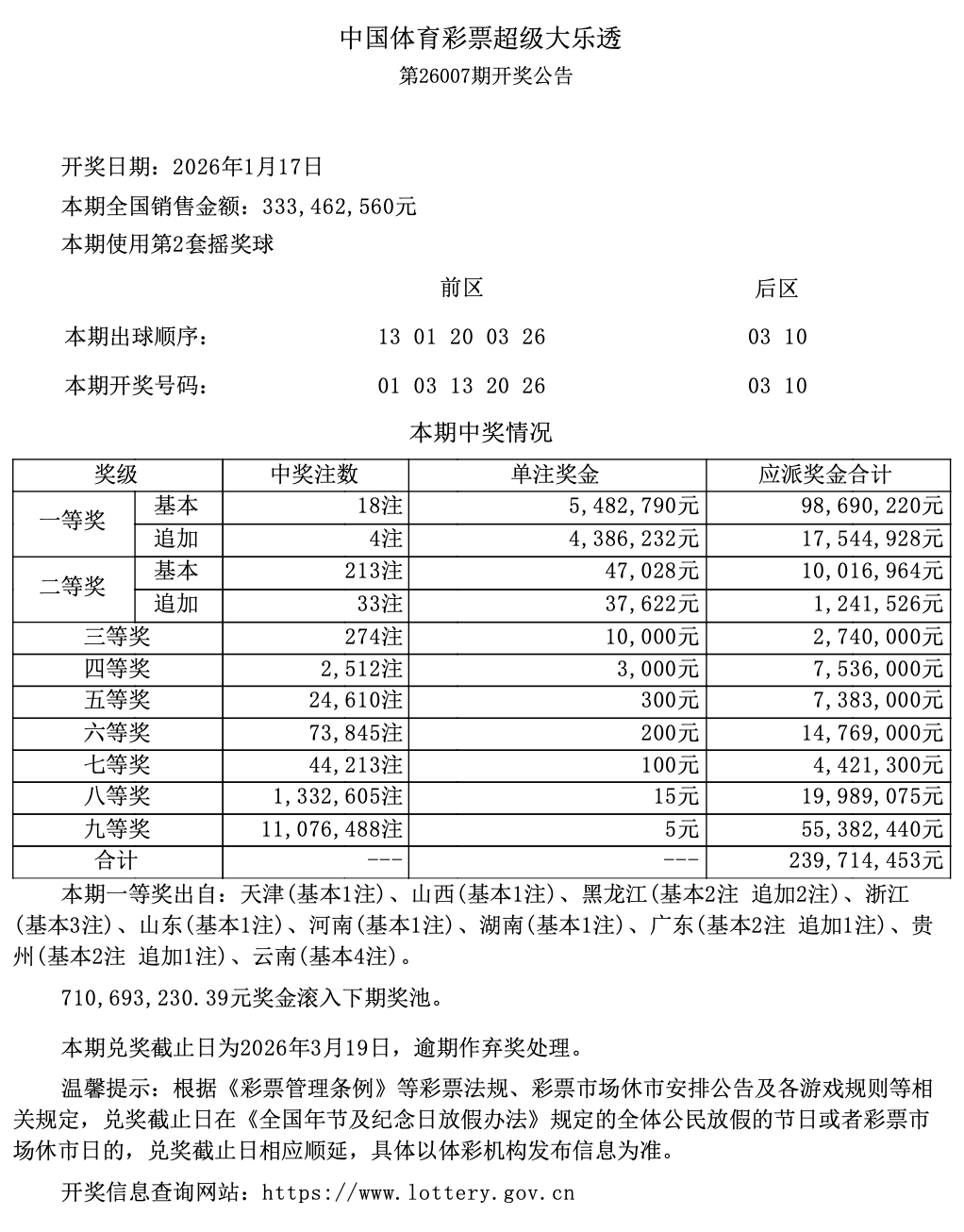 超级大乐透第26007期开奖