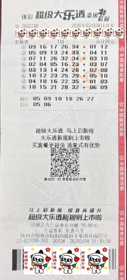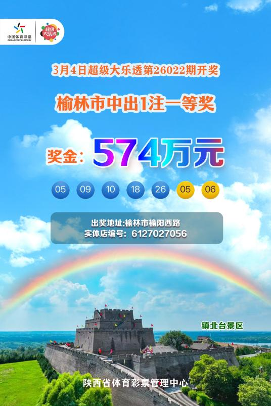 2026年3月4日超级大乐透第26022期开奖,陕西榆林中得1注一等奖,奖金574万元,大奖出自榆林市榆阳西路体育彩票实体店,编号:6127027056。这是大乐透新规则上市后我省中出的第三个大奖,也是2026年我省中出的第8个大乐透大奖。