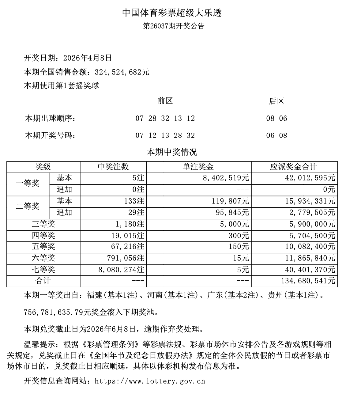 奖池资金累计756781635.79元奖滚入下期奖池