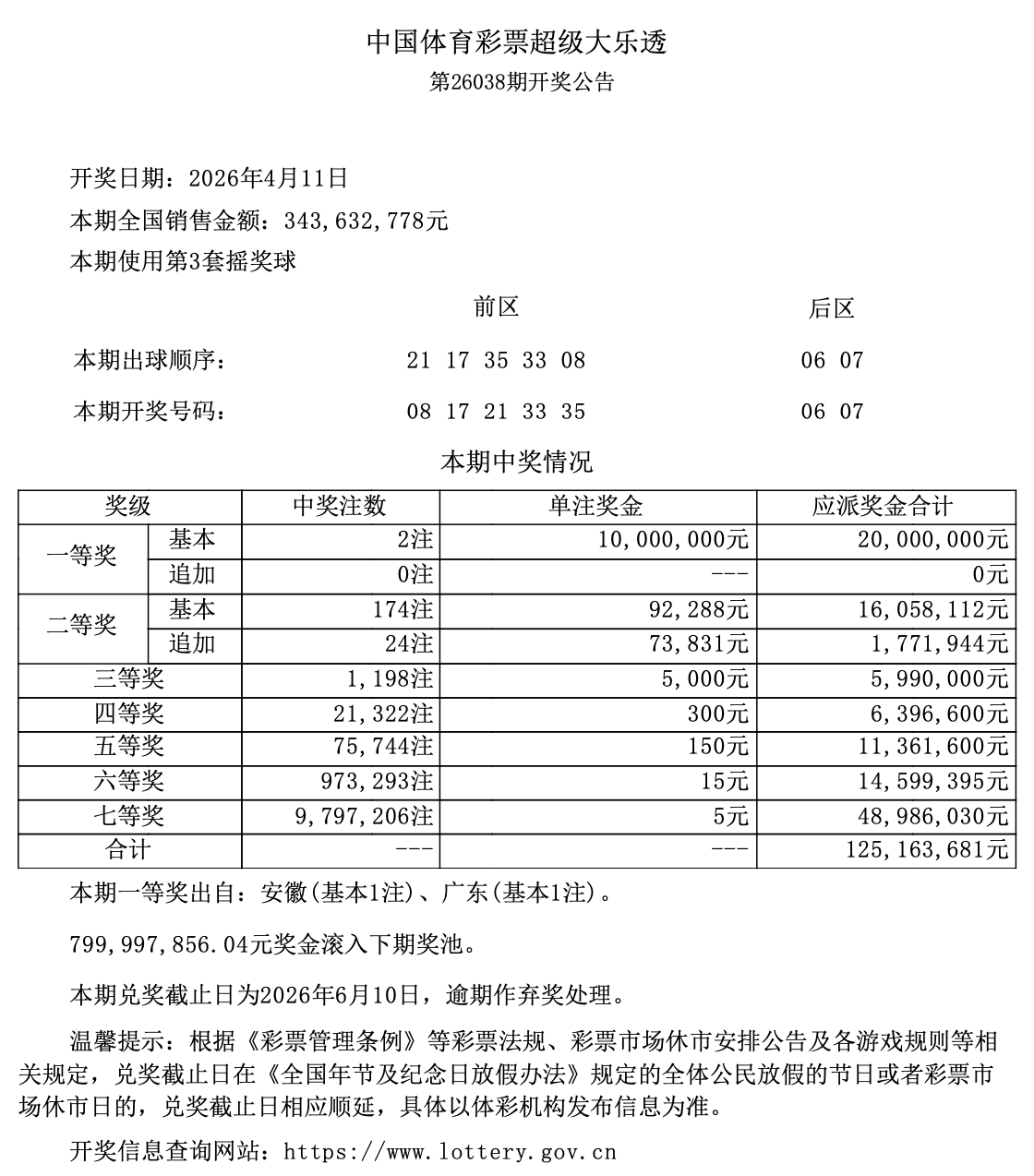 奖池资金累计799997856.04元奖滚入下期奖池