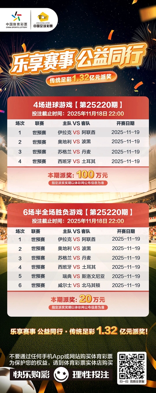 第25220期传足4/6场游戏特色奖期已经于2025年11月16日20:00开售,将于2025年11月18日22:00停售,并于11月19日开奖,其中伊拉克VS阿联酋、奥地利VS波黑、苏格兰VS丹麦、西班牙VS土耳其为4场进球游戏竞猜赛事。
