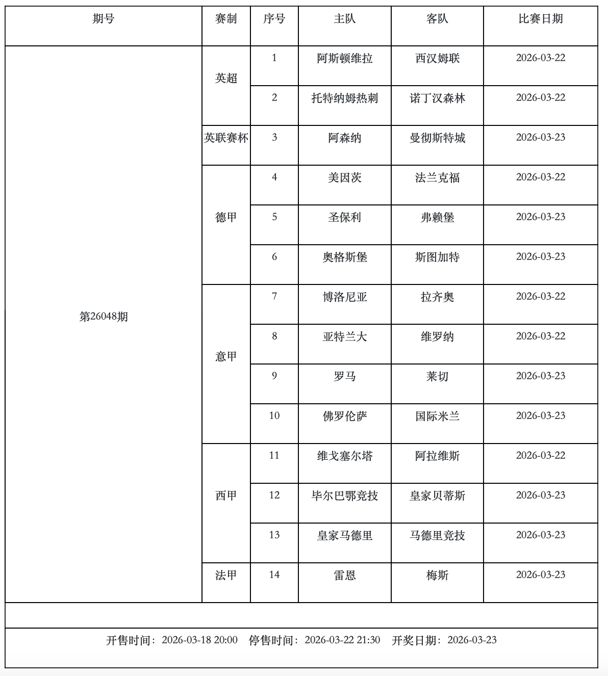 本周日传足胜负彩第26048期对阵不乏重量级对话,其中阿森纳和曼城将为英格兰联赛杯桂冠展开对决,皇马与马竞上演德比大战。此外国米将客场挑战佛罗伦萨,热刺则对阵诺丁汉森林。