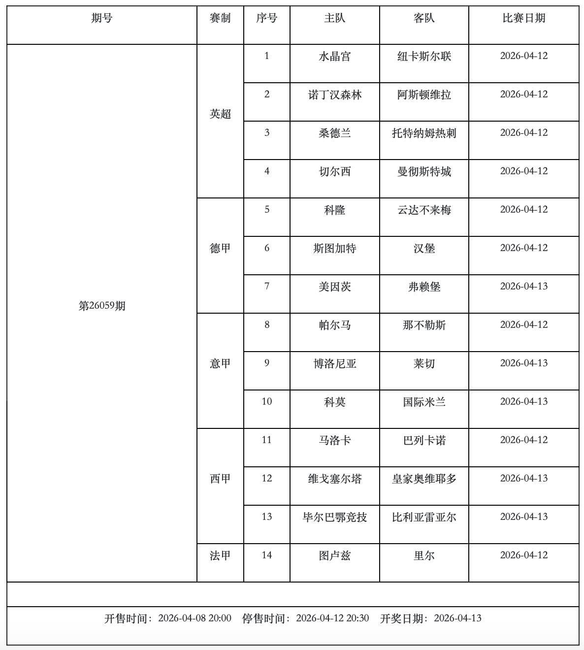 本周日的传足胜负彩第26059期竞猜对阵中,切尔西与曼城的强强对话尤为引人注目,而保级压力巨大的热刺将在客场对阵桑德兰,意甲方面,那不勒斯作客与帕尔马展开交锋,国米则遭遇本赛季的意甲黑马科莫。