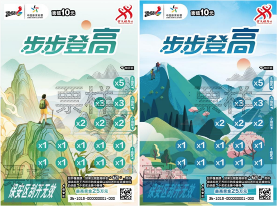 新年登高,是中华传统文化习俗,这不仅是祈福纳祥的温暖仪式,更是以健康活力的姿态开启全新篇章的积极宣言。体彩顶呱刮融合这一传统文化与体育精神,推出新年登高主题即开票——“步步登高”,面值10元,共有2个票面场景,票面分别采用了中式山水画及简约插画的形式,描绘出攀登者勇攀高峰、极目远眺的画面,远山叠嶂、云海翻腾的画面搭配明快色彩与简洁构图,既富有视觉张力,又传递出“新年节节高,更上一层楼”的美好寓意。