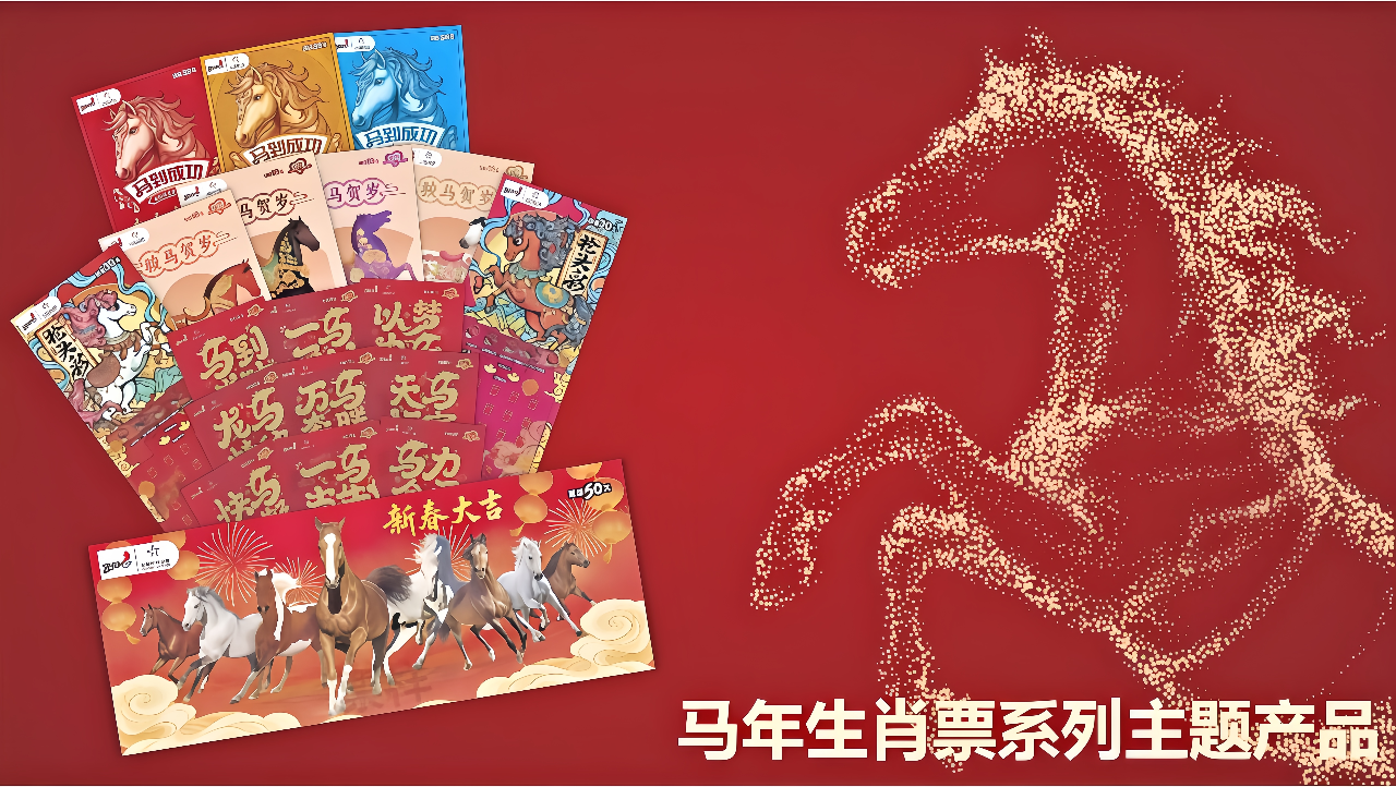 骏马奔腾迎新岁,好运奔涌入家门。2026年农历丙午马年如期而至,体彩顶呱刮也如约推出五款马年生肖主题即开票,以传统文化为墨,以新春祝福为笔,绘就一幅“马上有喜、马到成功”的吉祥画卷。