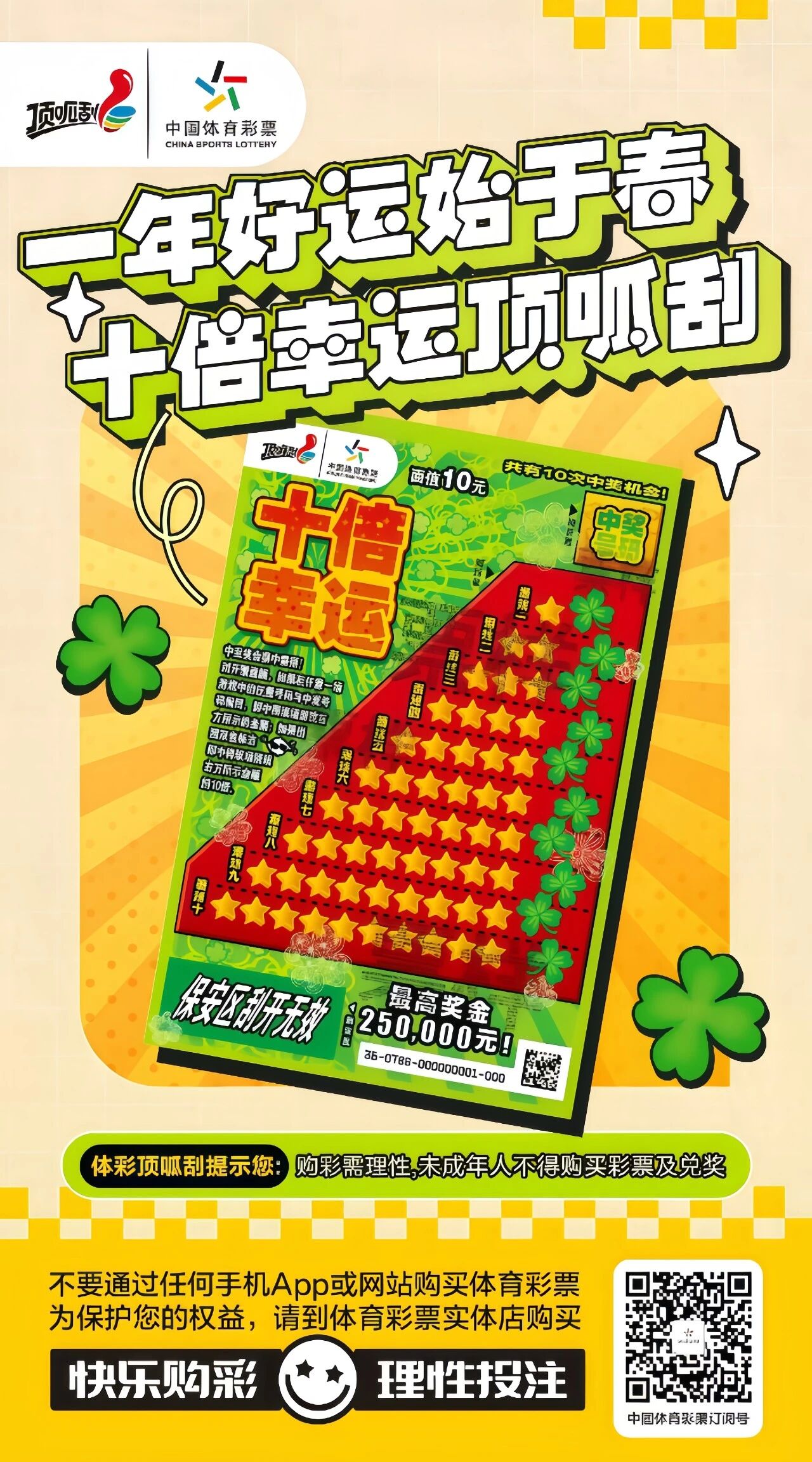 春风拂面,万物复苏,又是一年春光好。当嫩绿爬上枝头,当暖阳洒满大地,每个人都在期待一份“开年好运”。中国体育彩票“顶呱刮”系列即开票——“十倍幸运”,带着“一年好运始于春”的祝福与“十倍幸运顶呱刮”的惊喜,开启新一年的幸运篇章!
