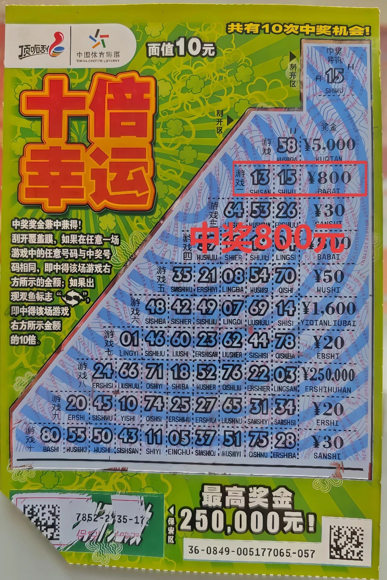 把“十倍幸运”即开票拿在手中,首先映入眼帘的是满眼的生机与活力:票面以生机勃勃的绿色为底色,搭配红色底版与黄色的星星、四叶草元素,仿佛将春天的明媚与好运的符号浓缩在方寸之间。“一年好运始于春 十倍幸运顶呱刮”的宣传语醒目大气,票面中央的刮开区布满星星图案,尽显青春活泼,让人忍不住想立刻拿起,刮开属于自己的那份幸运。