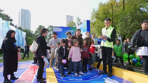 “体育科普及体质检测区”亦是现场的热门打卡地。立定跳远、原地平衡力测试、形体墙测试、趣味保龄球四大项目错落排布,专业教练俯身指导动作要领,还会根据测试者的年龄段精准评估结果,同步讲解运动科普知识 —— 从发力技巧到健康常识,细致的解读让市民在动起来的同时,也收获了实用的健康干货。