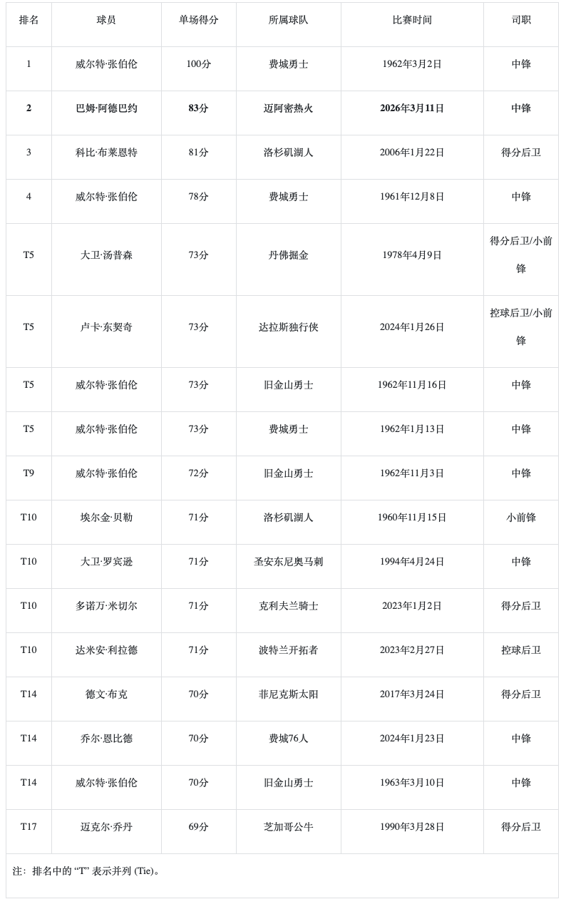 凭借这场史诗级得分表演,阿德巴约成功超越科比·布莱恩特的81分神迹,跃居美职篮历史单场得分榜第二位,成为联盟历史上第二位斩获80+得分的球员。