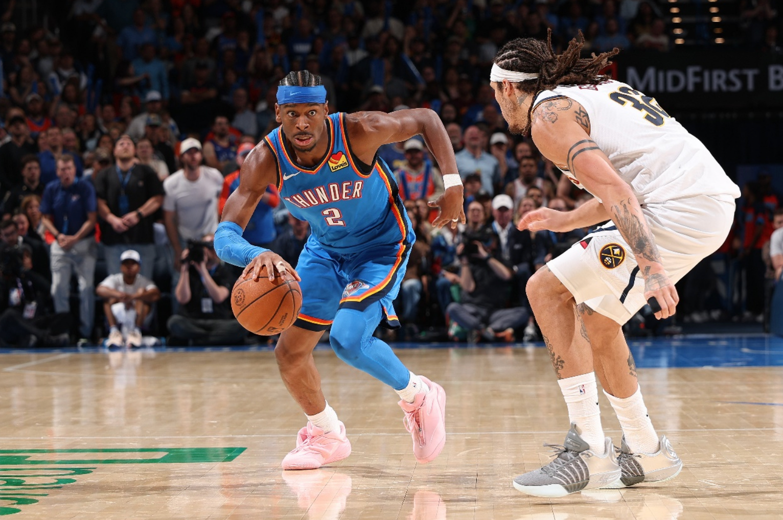 掘金本赛季至今战绩为52胜28负,场均得121.9分,场均失117分。上场比赛,掘金主场136-119战胜灰熊,全队8人得分上双,约基奇高效拿到14分16篮板的三双数据,贾马尔·穆雷26分7篮板5助攻,卡梅隆·约翰逊18分3篮板,布鲁斯·布朗13分7篮板,瓦兰丘纳斯14分4篮板。掘金近期迎来10连胜,状态上佳。球队本赛季主场战绩为27胜13负。掘金目前在胜场差上领先火箭和湖人,极大概率拿到西部第三。本场阿隆·戈登、约基奇和贾马尔·穆雷均出战成疑,斯宾塞· 琼斯和佩顿·沃特森确定缺席。本赛季常规赛两队已经交锋3次,掘金均不敌雷霆。
