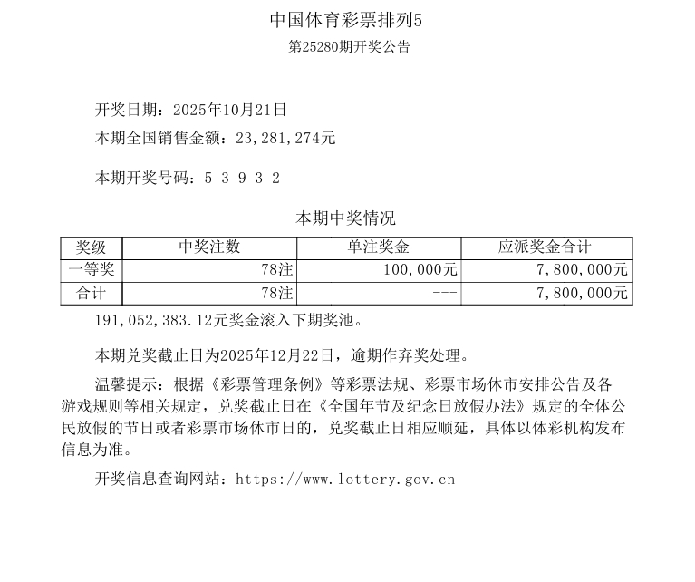 排列5 第25280期开奖 5 3 9 3 2