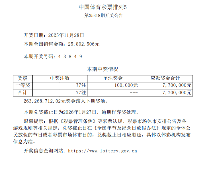 排列5 第25318期开奖 4 3 8 4 9