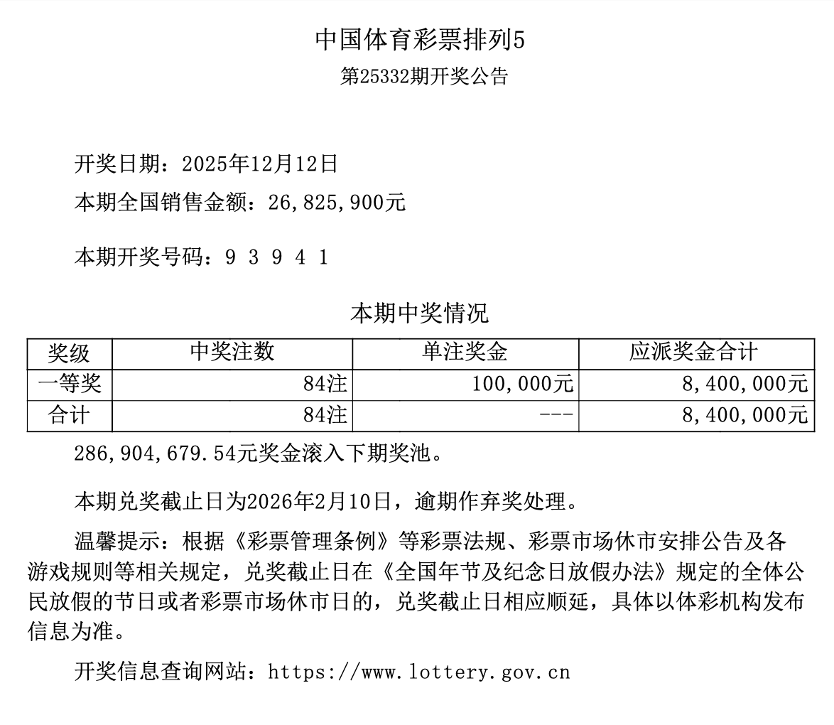 排列5 第25332期开奖 9 3 9 4 1