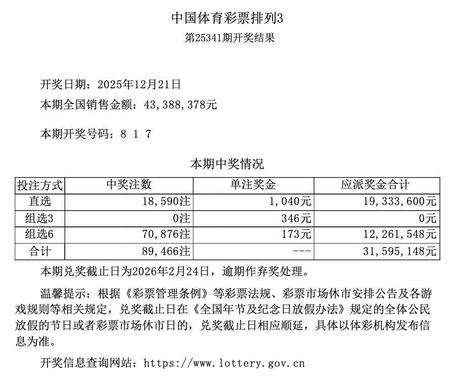 排列3 第25341期开奖 8 1 7