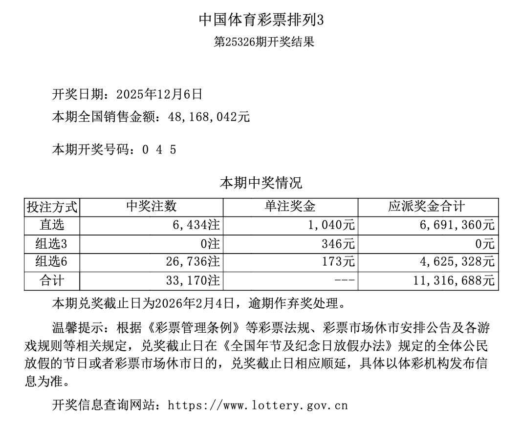排列3 第25326期开奖 0 4 5
