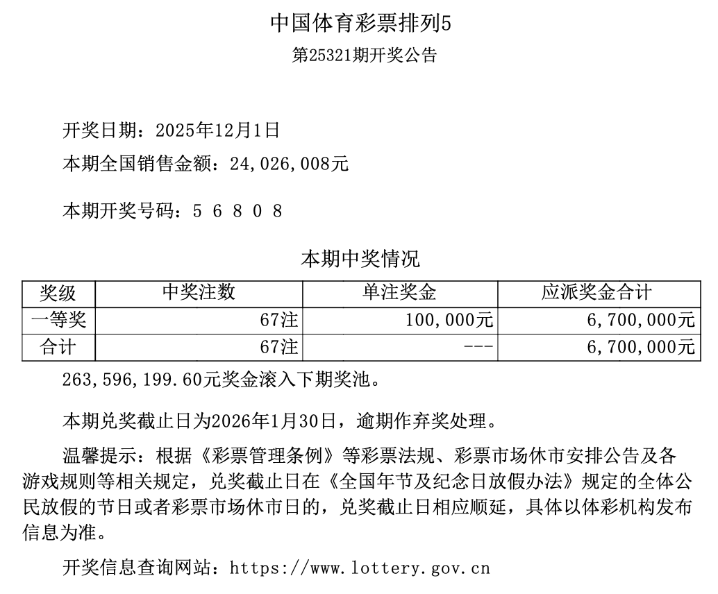 排列5 第25321期开奖 5 6 8 0 8