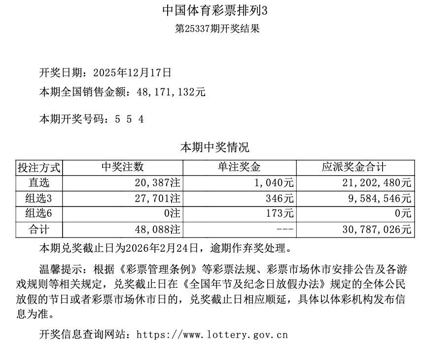 排列3 第25337期开奖 5 5 4
