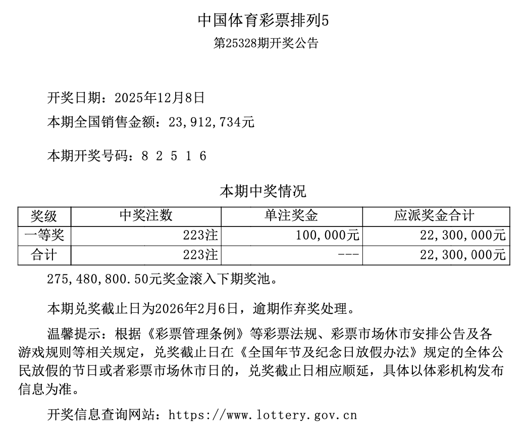排列5 第25328期开奖 8 2 5 1 6