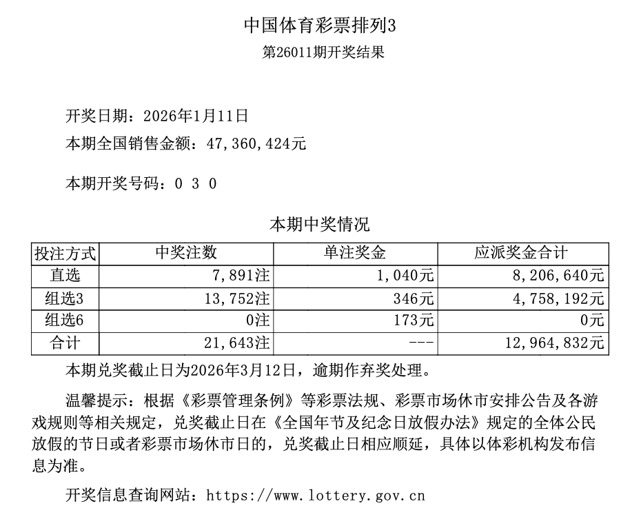 排列3 第26011期开奖 0 3 0