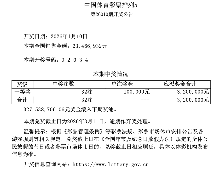 排列5 第26010期开奖 9 2 0 3 4