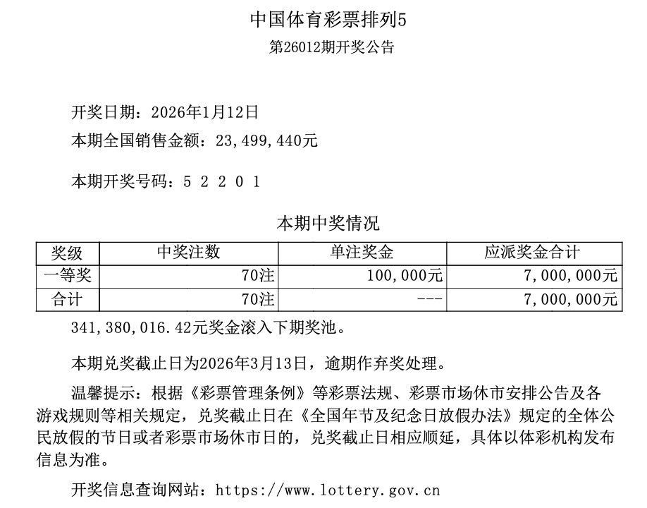 排列5 第26012期开奖 5 2 2 0 1