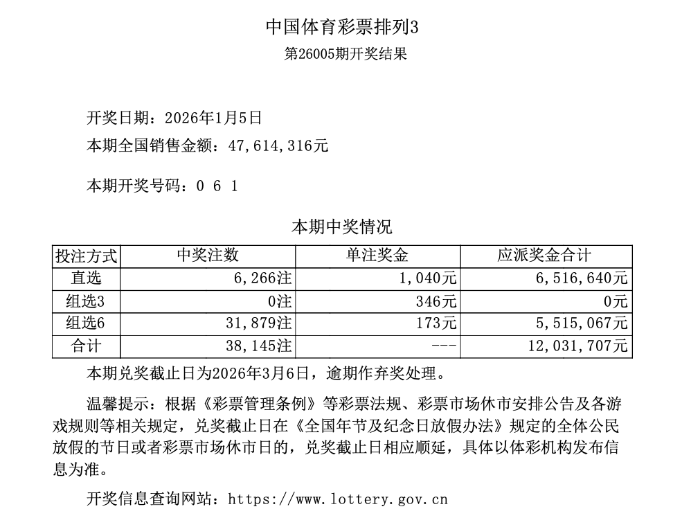 排列3 第26005期开奖 0 6 1