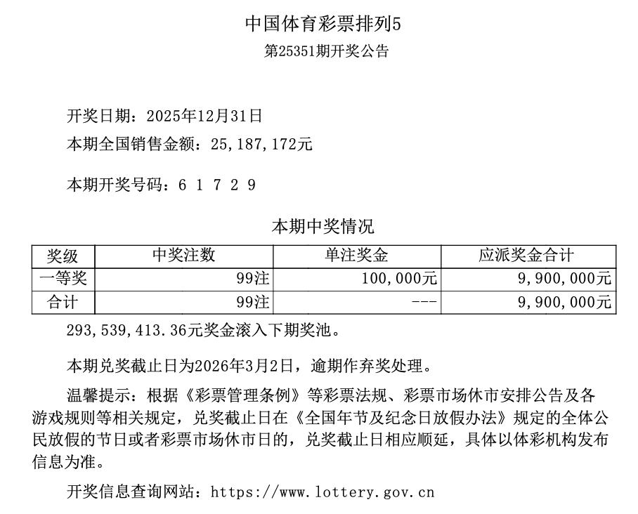 排列5 第25351期开奖 6 1 7 2 9