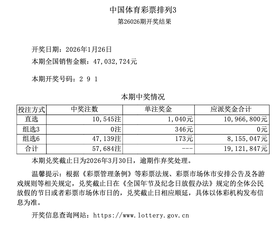 排列3 第26026期开奖 2 9 1