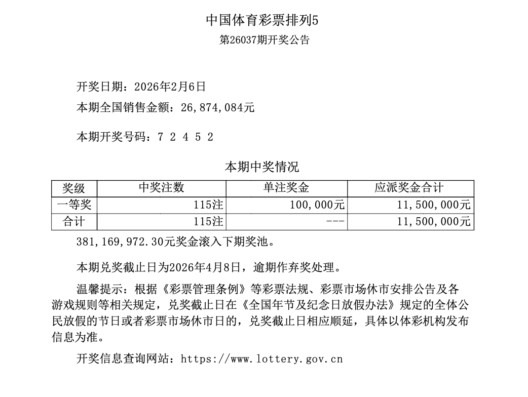 排列5 第26037期开奖 7 2 4 5 2