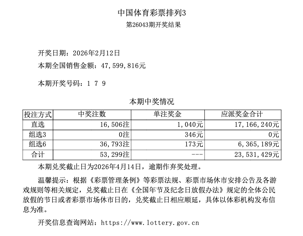 排列3 第26043期开奖 1 7 9