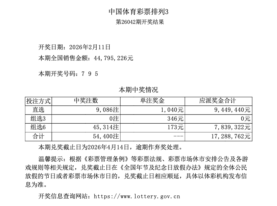 排列3 第26042期开奖 7 9 5