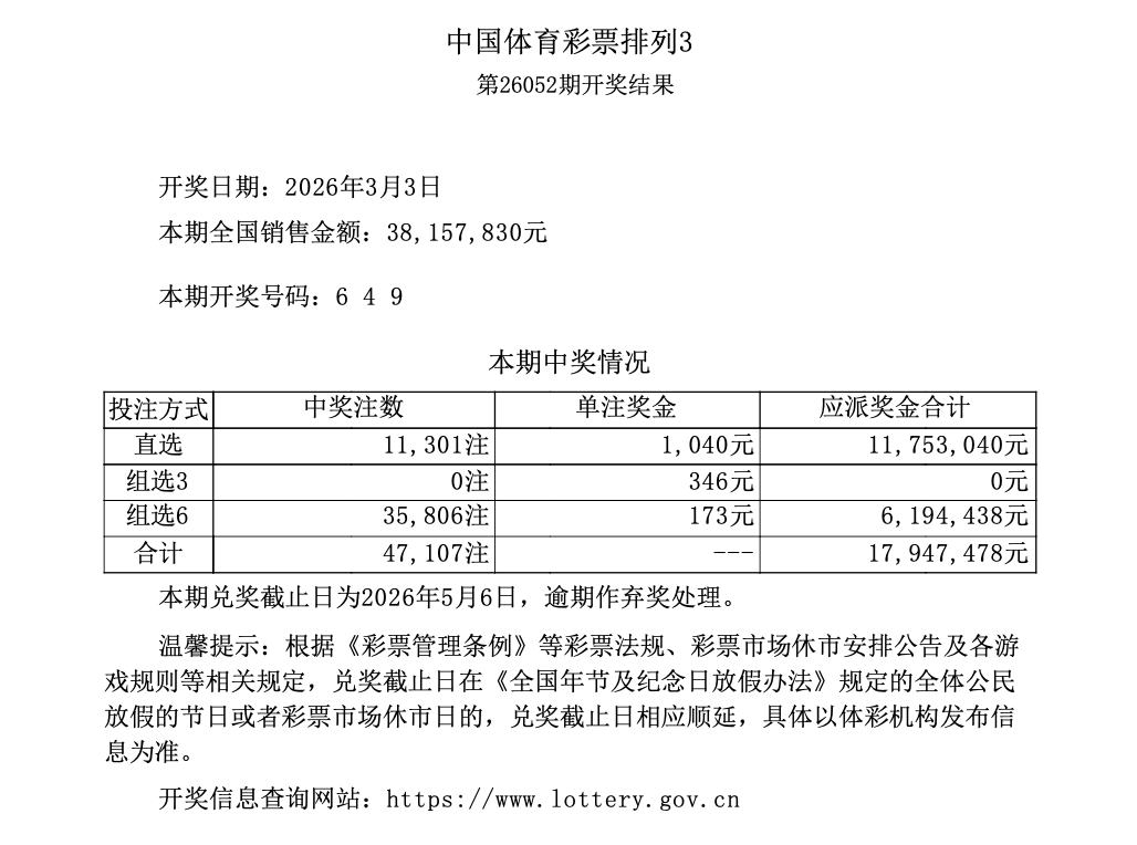排列3 第26052期开奖 6 4 9