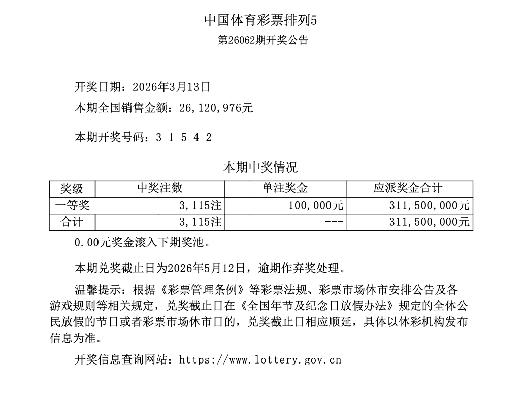 排列5 第26062期开奖 3 1 5 4 2