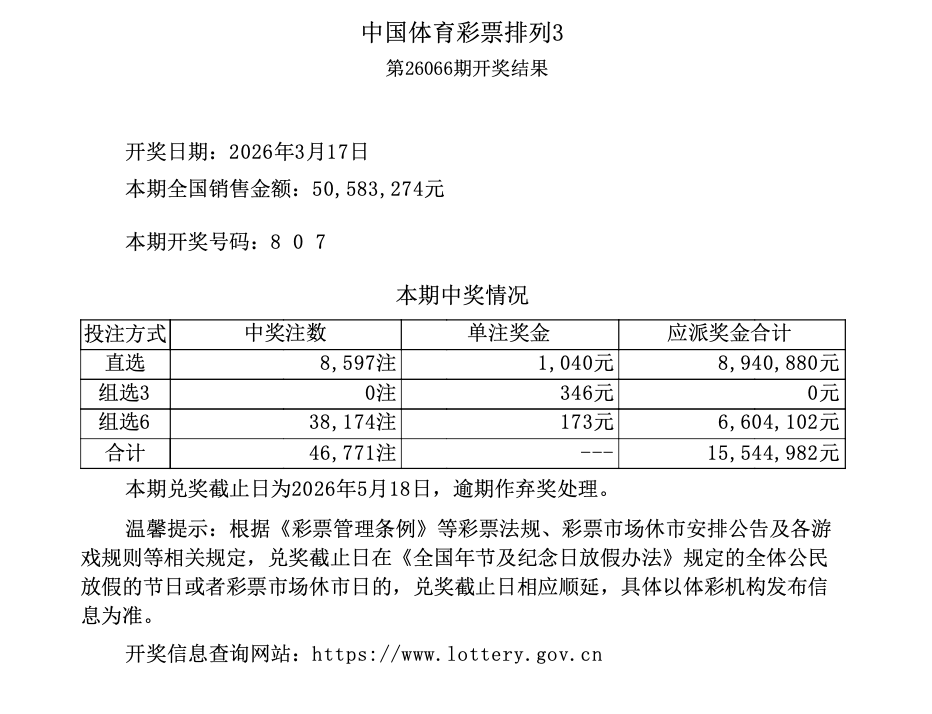排列3 第26066期开奖 8 0 7