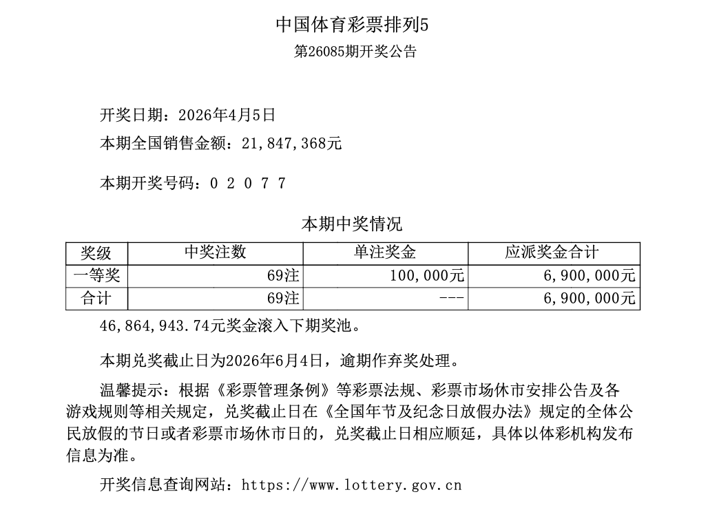排列5 第26085期开奖 0 2 0 7 7
