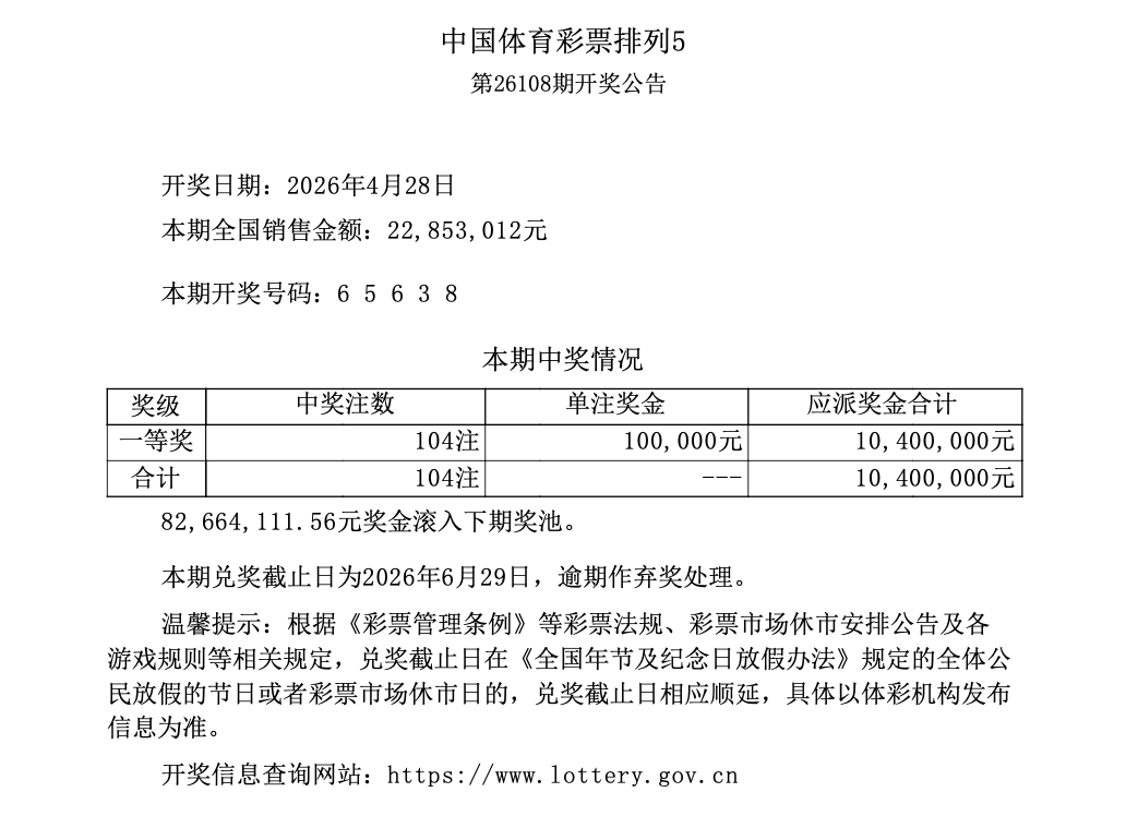 排列5 第26108期开奖 6 5 6 3 8
