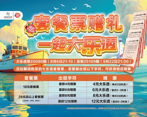 从8月6日(第25090期)至9月22日(第25109期),连续20期,只要购买大乐透套餐票,惊喜或许就藏在票面上等待您亲手开启!