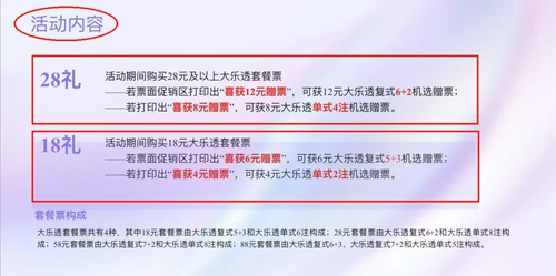 购买28元、58元、88元大乐透套餐票,若票面促销区打印出“喜获12元赠票”或者“喜获8元赠票”,可获12元大乐透复式6+2机选赠票,或者8元大乐透单式4注机选赠票。