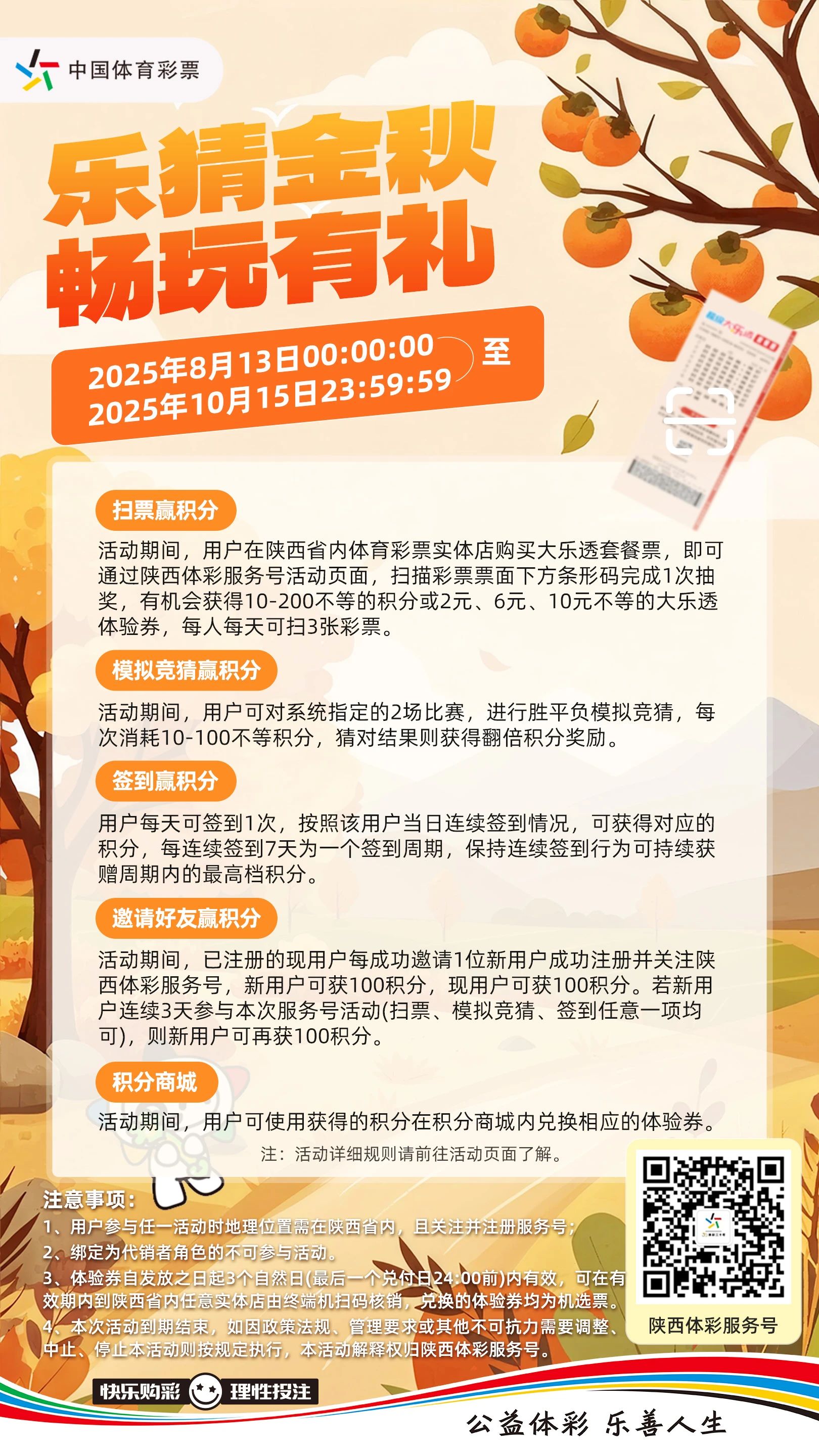 小长假来袭,陕西体彩“乐猜金秋,畅玩有礼”活动迎来了双节黄金参与期!即日起至10月15日,我们为你备好了多重福利,陪你一起欢度这个超长假期~
