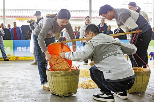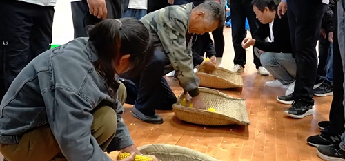 本次比赛设团体农人三项和个人农耕挑战赛两大类。在晒场收谷比赛中,选手们分工协作,两名队员动作娴熟地将玉米粒迅速装入箩筐,一名队员挑起扁担奔向终点。“巧手剥玉米”项目中,参赛选手们手指翻飞,展现了农民日常劳作的熟练技巧。