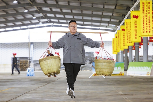 个人项目农耕挑战赛同样精彩。挑担接力赛中,选手们肩扛扁担,稳步前行;“同心锯木”项目考验着两人的默契,锯条在木材间来回穿梭;“手推车运山珍”项目里,运动员推着满载“山珍”的手推车快速驶向终点。