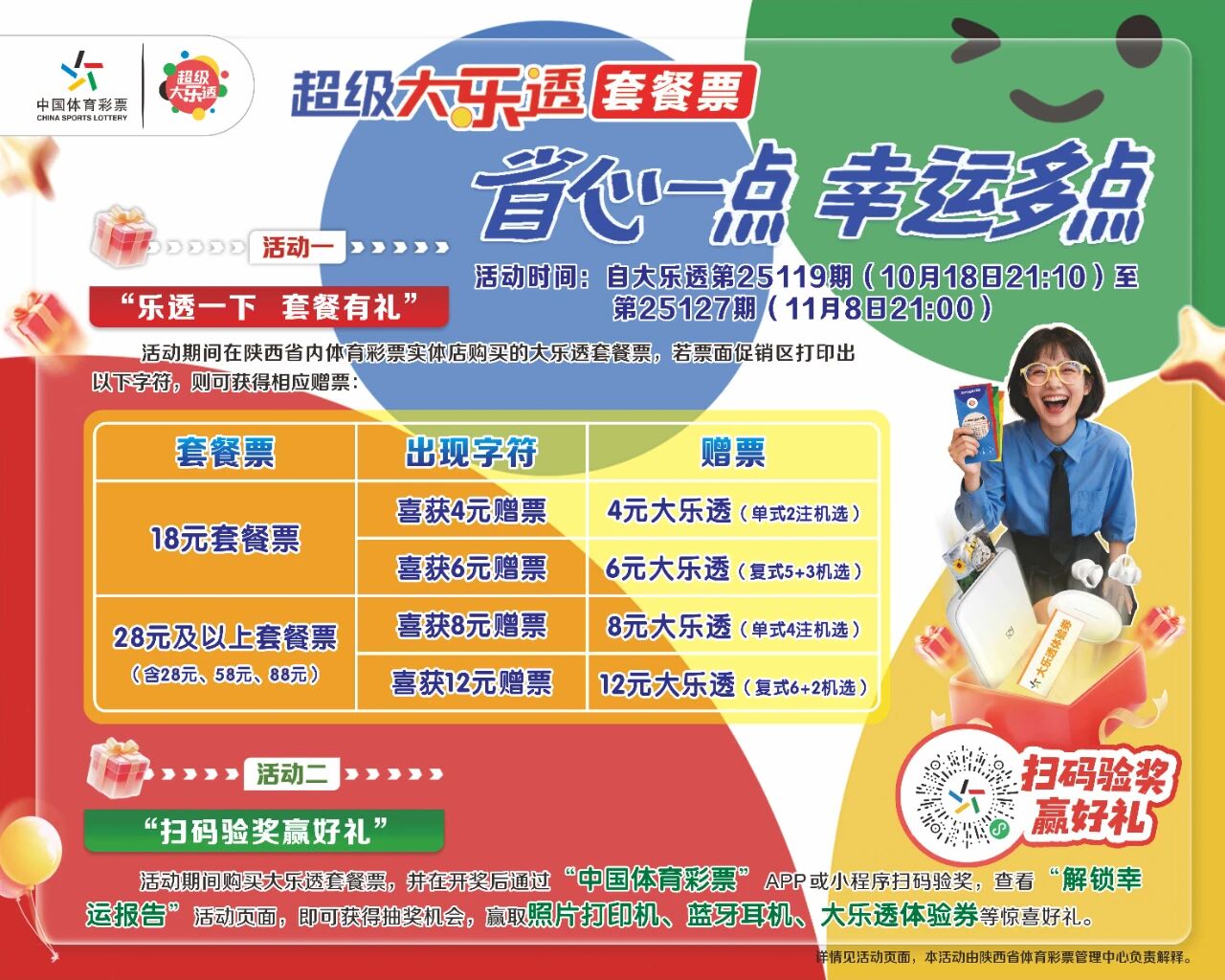 本次活动时间自大乐透第25119期(10月18日21:10)开始,至第25127期(11月8日21:00)结束,横跨9期开奖,为购彩者提供了充裕的参与周期。活动期间,凡在陕西省内任一体育彩票实体店购买大乐透套餐票,即可自动参与,享受赠票与抽奖双重福利。