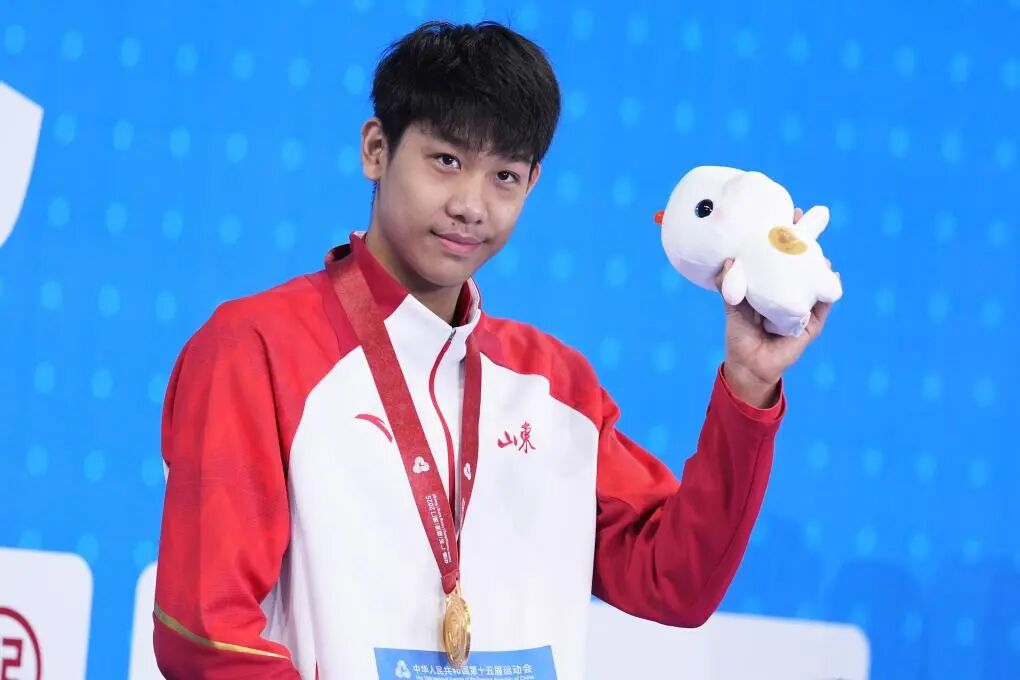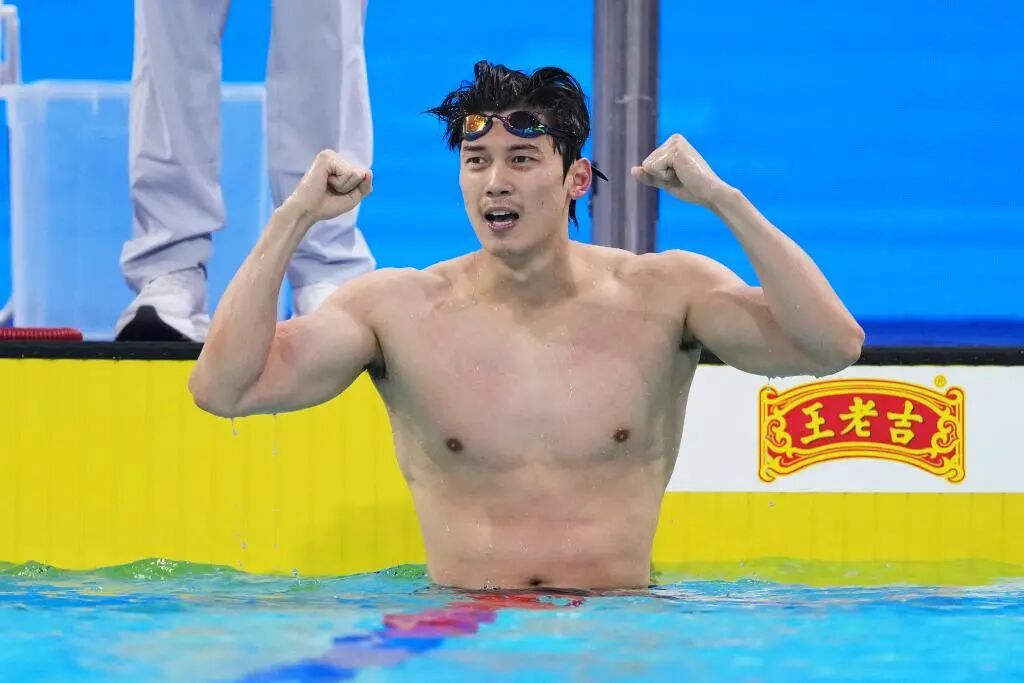 11月17日,第十五届全国运动会游泳男子400米个人混合泳决赛在广东省深圳市举行,浙江队选手汪顺在比赛后庆祝夺冠。