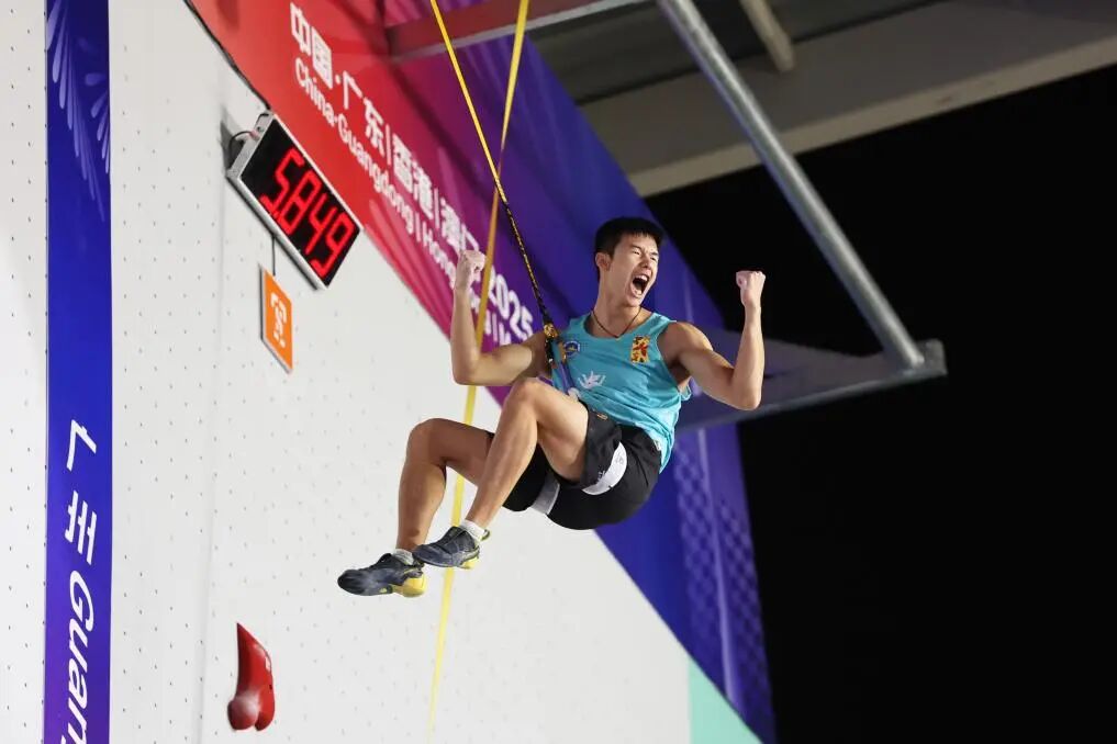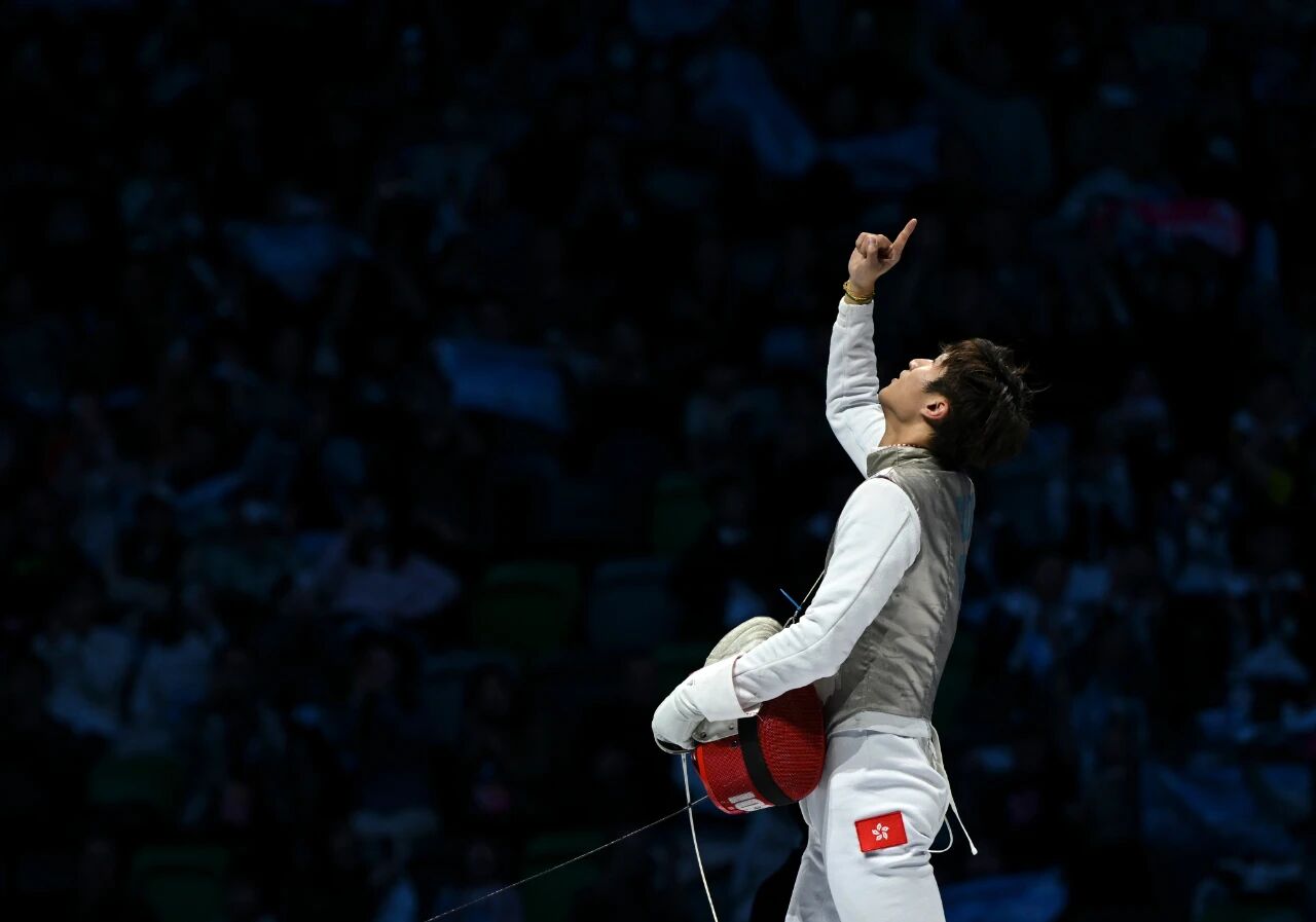 11月19日,香港队选手蔡俊彦在比赛后庆祝夺冠。当日,在香港进行的第十五届全国运动会男子花剑团体金牌赛中,香港队45比34战胜福建队,夺得金牌。