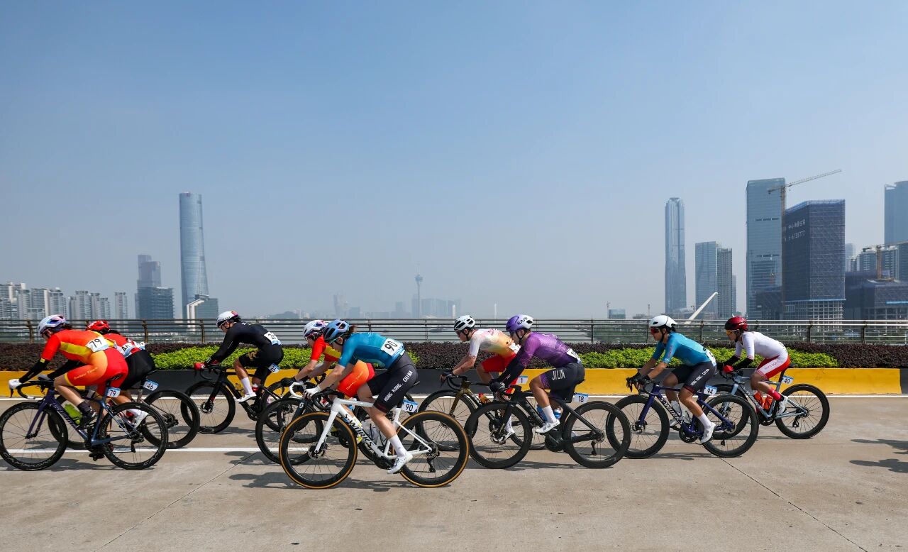 11月9日,参赛选手在比赛中。当日,第十五届全国运动会公路自行车女子个人赛决赛举行。