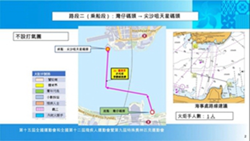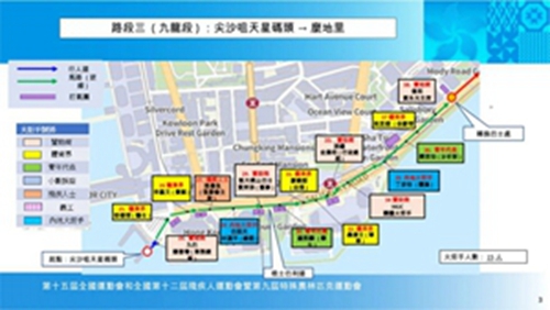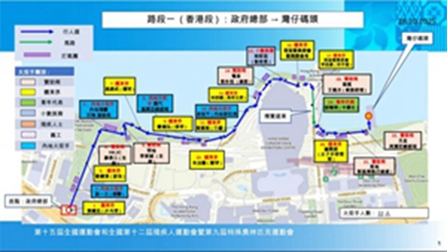 香港赛区的火炬路线以添马政府总部为起点,并以十五运会香港主场馆启德体育园为终点,横越维多利亚港两岸并途经多个香港著名地标,包括添马公园、中环和湾仔海滨、金紫荆广场、香港文化中心和香港太空馆。除跑步方式外,也会使用渡轮和开篷巴士。